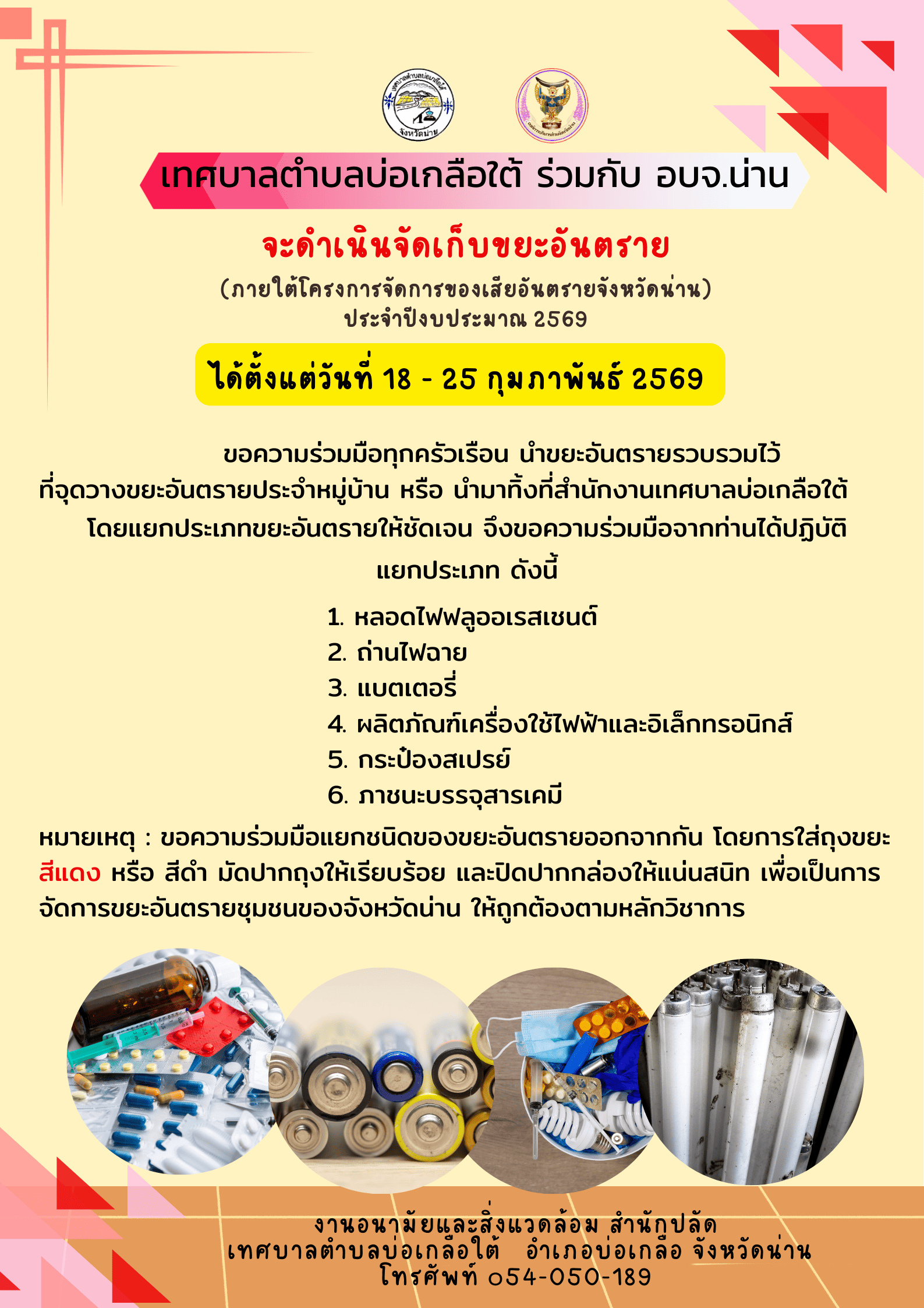 วันที่ 18 - 25 กุมภาพันธ์ 2569 เทศบาลตำบลบ่อเกลือใต้ร่วมกับ อบจ.น่าน จะดำเนินการจัดเก็บขยะอันตราย